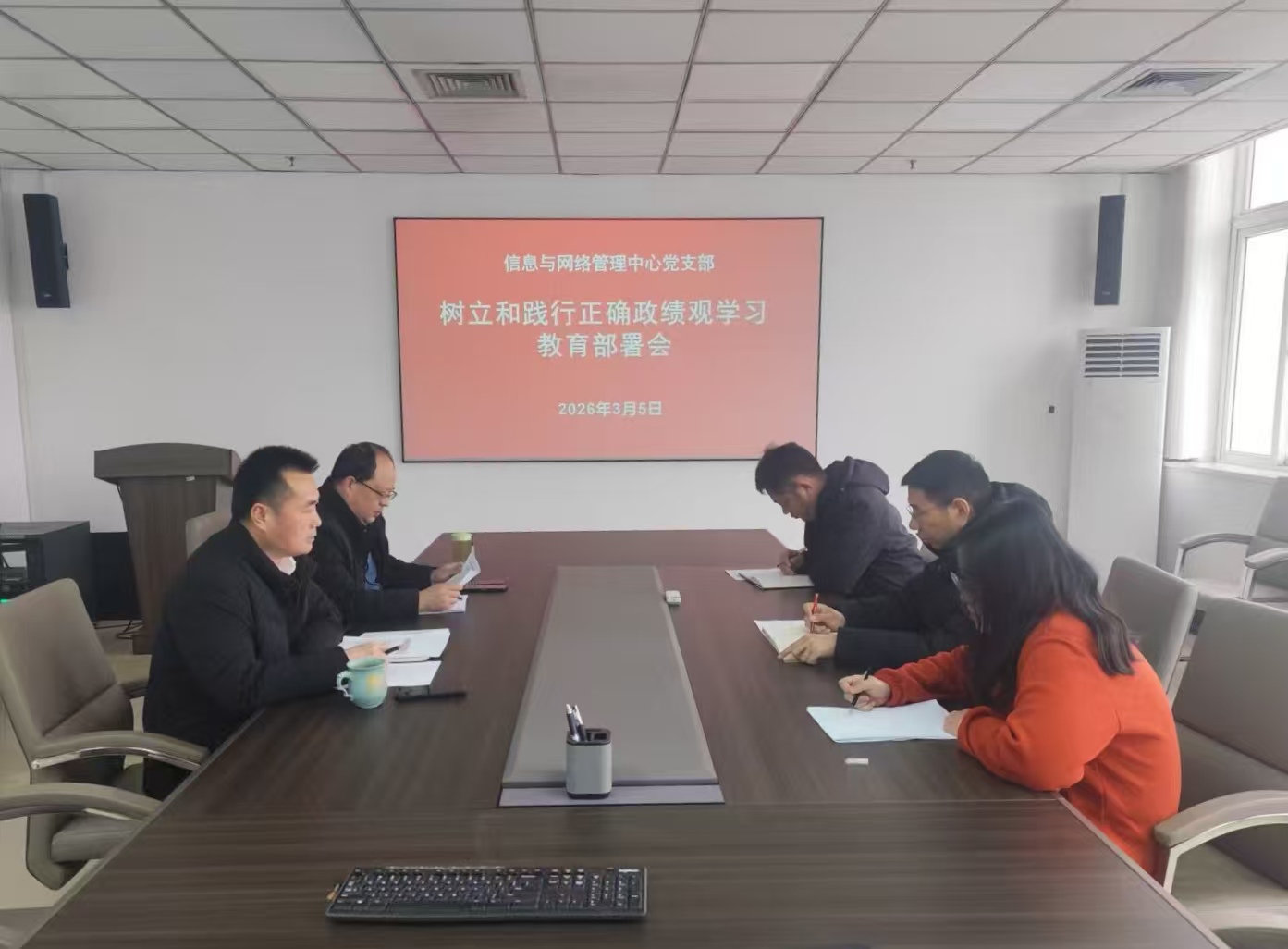 为响应我校党委的号召,2026年3月5日上午,信息与网络管理中心党支部在图书馆八楼会议室召开树立和践行正确政绩观学习教育部署会,会议由中心党支部书记马小雨主持,中心党支部全体党员参加。