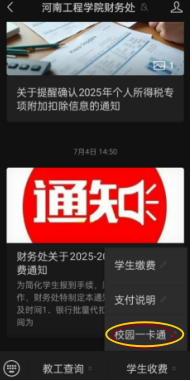 2. 即日起,校园一卡通查询、挂失,以及校内电费支付等业务,将统一转入校园内部网络运行(相关业务操作依赖校园网服务,一卡通的相关业务需关注河南工程学院财务处公众号后,选择校园一卡通选项进入相关页面)。
